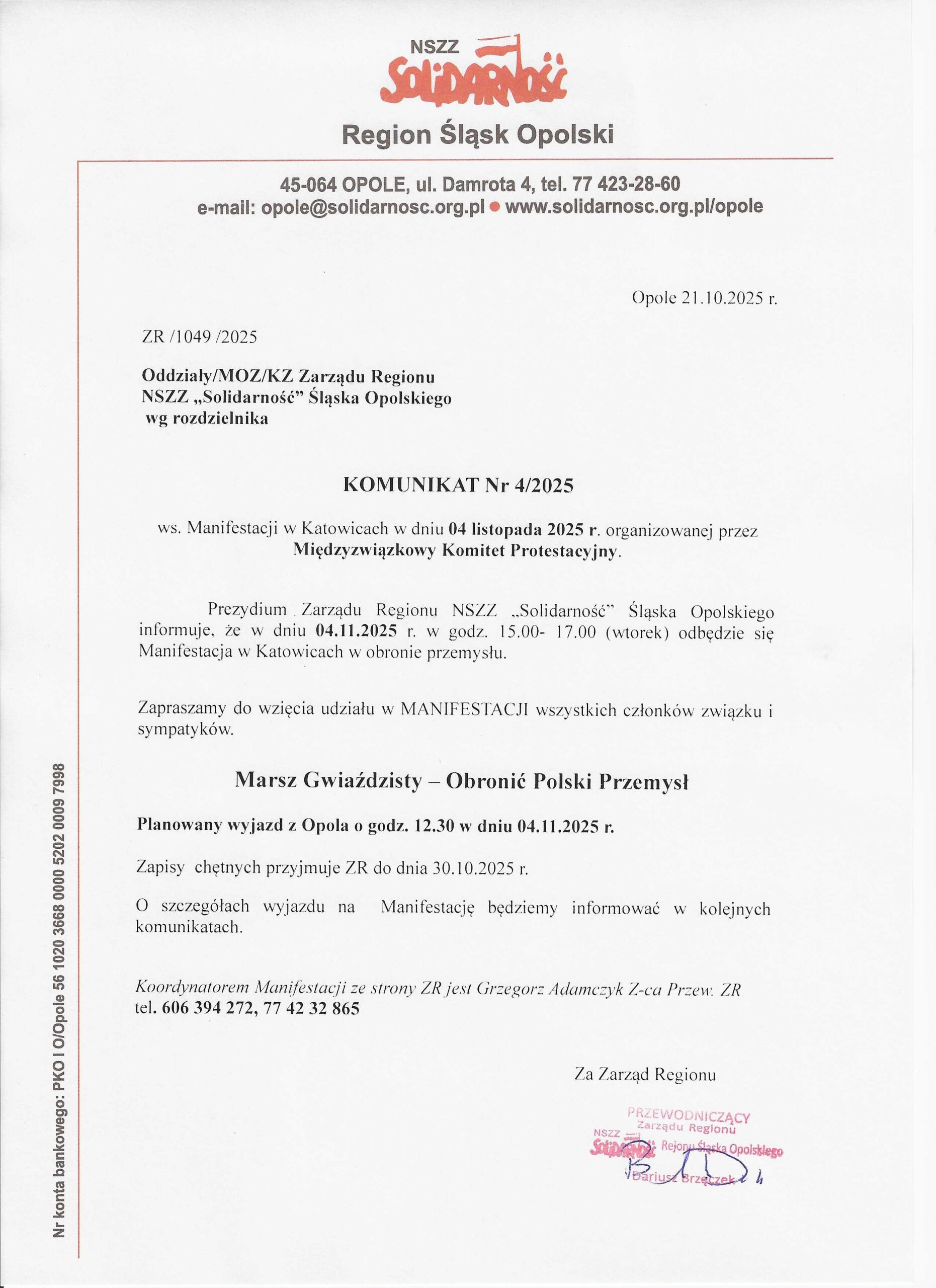 We wtorek 4 listopada w godz. 15.00 – 17.00 odbędzie się w Katowicach organizowana przez Międzyzwiązkowy Komitet Protestacyjny Manifestacja w obronie przemysłu. Zapraszamy do udziału wszystkich członków związku i sympatyków.