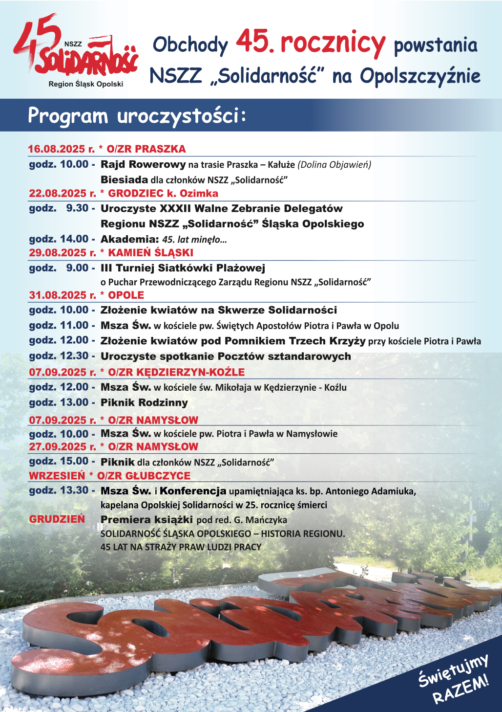 Program obchodów 45. rocznicy powstania NSZZ „Solidarność” na Opolszczyźnie